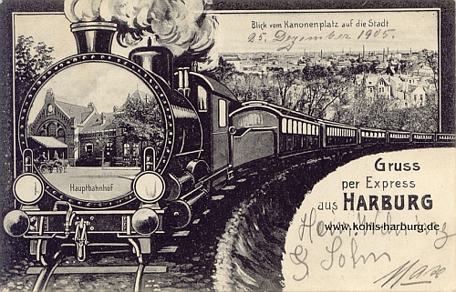 Gruss per Express aus HARBURG Hauptbahnhof / Blick vom Kanonenplatz auf die Stadt No. 1065 A. W., Harburg 81257 [ T ] 1905