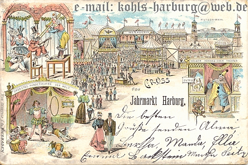 Wäre diese AK nicht in Harburg (Elbe) gestempelt worden, könnte man vermuten das es sich um Harburg (Schwaben) handelt. Dafür würden sprechen, das keine "festen" Gebäude und Bauwerke abgebildet wurden, sondern nur auf- und abbaubare Jahrmarkts-Buden und "Fahrgeschäfte".