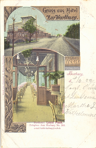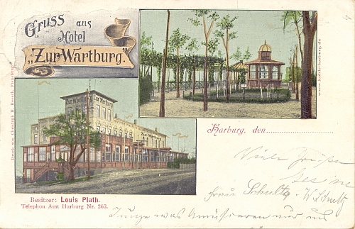 Hotel zur Wartburg am Fusse der Haake Besitzer Louis Plath, Tel. Amt Harburg No. 263 1554 Otto Laaser, Hamburg [ T ] 1908- |