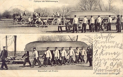 Übungen am Brückenwagen / Mannschaft mit Ponton