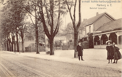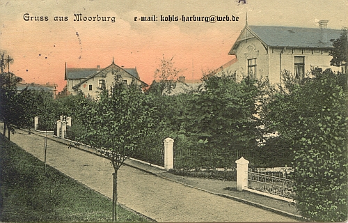 Vom unteren Bildrand zur Mitte verläuft die Moorstrasse, sie mündet in die Hannoversche Strasse (In der Bildmitte, von Links nach Rechts). Das Gebäude mit dem Dachreiter (Turm) war das Bahnhofs-Hotel, Moorstrasse 12. Das große rotbraun colorierte Gebäude, neben dem Schornstein ist der 3. Harburger Bahnhof. Der Schornstein gehört zur PHOENIX (Reifen, Gummistiefel, Tennisbälle u. v. m.). Das (relativ) freie Gelände in der Bildmitte war später, 1919 bis 1923, der Kohlenwaschplatz des Bergwerkes Robershall in der Emme (wie die Haake ein Teil der Harburger Berge).